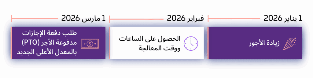 عندما تحصل على زيادة في الراتب، يُرجى مراعاة وقت المعالجة هذا عند تقديم جميع طلبات مزايا الإجازات مدفوعة الأجر (PTO).