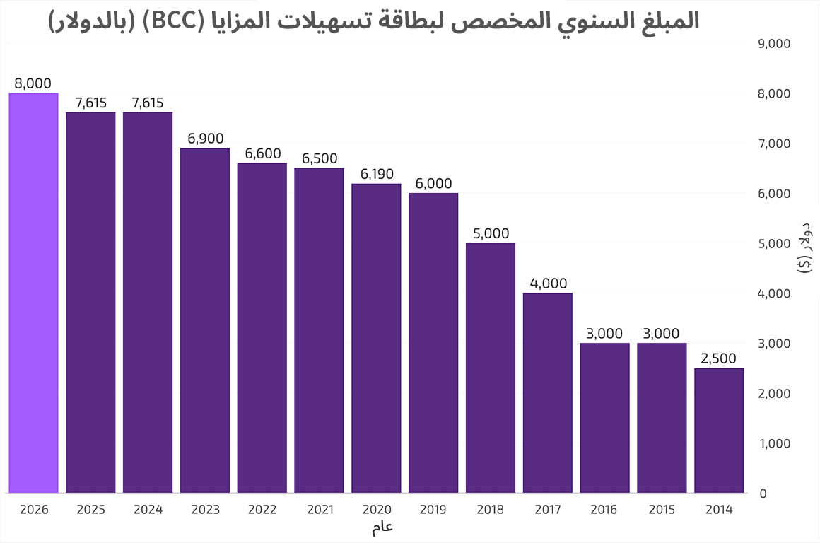 يوضح هذا الرسم البياني المبلغ السنوي المتاح لبطاقة تسهيلات المزايا (BCC) والمخصص للمصروفات النثرية المغطاة منذ بداية هذا البرنامج.
