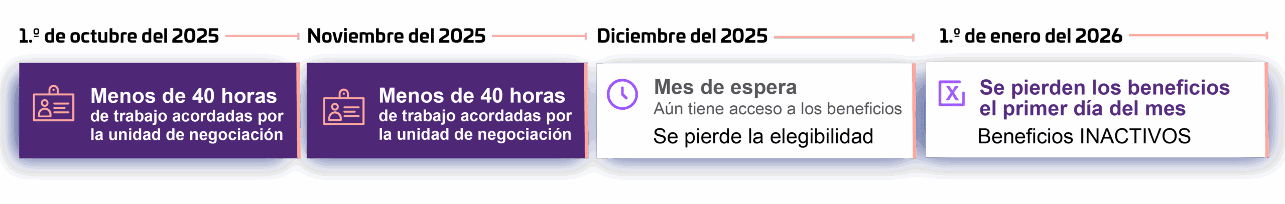 Por ejemplo, si usted trabaja menos de 40 horas en octubre, pero trabaja 40 horas o más en noviembre, usted conservará la elegibilidad para recibir los beneficios. No obstante, si trabaja menos de 40 horas en octubre y además trabaja menos de 40 horas en noviembre, usted perdería la elegibilidad para recibir los beneficios a partir del 1.º de enero del 2026.