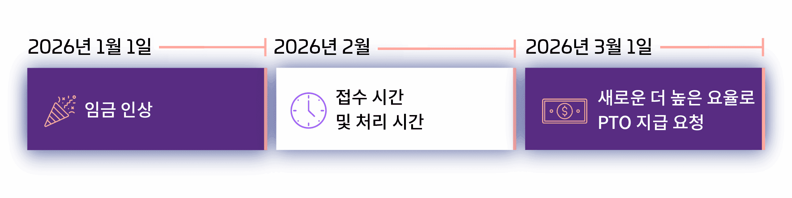 SEIU 503 교섭 단위 덕분에 돌봄종사자는 2026년 1월 1일부터 임금 인상을 받게 됩니다! 새로 인상된 요율로 PTO를 지급받으려면 2026년 3월 1일 이후에 PTO를 요청해야 합니다. 이것은 한 달 동안 받은 급여율 조정분이 다음 달 말까지 PTO 적립액에 반영되지 않기 때문입니다.