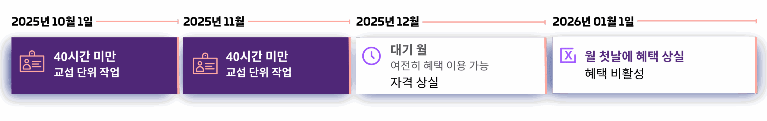 예를 들어 10월에 40시간 미만으로 근무했지만 11월에 40시간 이상 근무하는 경우 혜택 자격은 유지됩니다. 그러나 10월에 40시간 미만으로 근무하고 11월에도 40시간 미만으로 근무하는 경우 2026년 1월 1일부로 혜택 자격을 상실하게 됩니다.