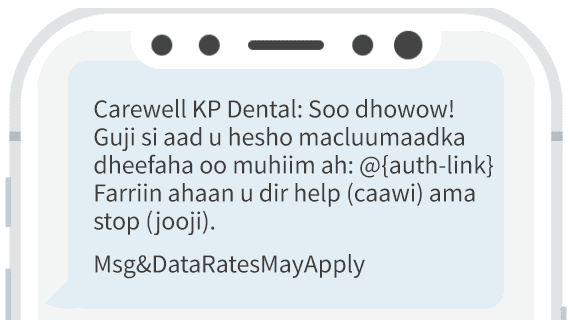 Waxa laga yaabaa inaad ku hesho fariin qoraal ah taleefonkaaga gacanta oo aad ka hesho Carewell Kaiser Permanente Dental kaas oo sidan u eg.