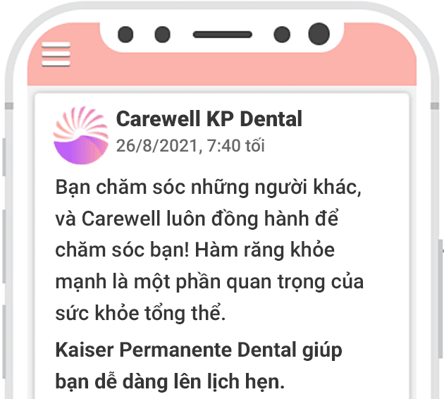 Đây không phải là tin nhắn lừa đảo! Chúng tôi muốn đảm bảo tất cả mọi người đều biết về phúc lợi nha khoa dành cho họ. Vì vậy, chúng tôi thí điểm cách giao tiếp mới bằng tin nhắn văn bản để cung cấp mọi thông tin về chương trình Carewell Kaiser Permanente Dental tận tay bạn!