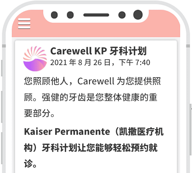 这不是诈骗短信!我们希望每个人都能了解自己的牙科福利,所以我们在尝试使用新的通信方式,用短信通知您的 Carewell Kaiser Permanente(凯撒医疗机构)牙科计划,手指轻触即可获知。